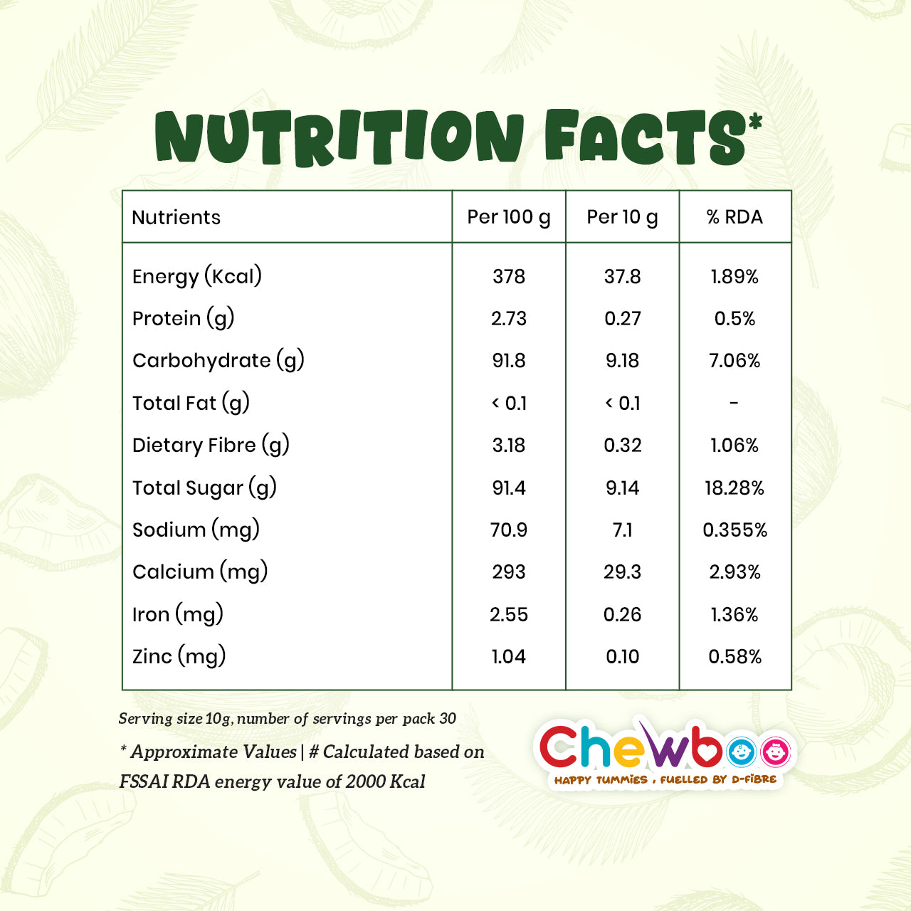 Chewboo Coconut Sugar is made from the sap of coconut palm blossoms, gently heated and crystallised to create a natural sweetener that is less processed compared to refined white sugar.